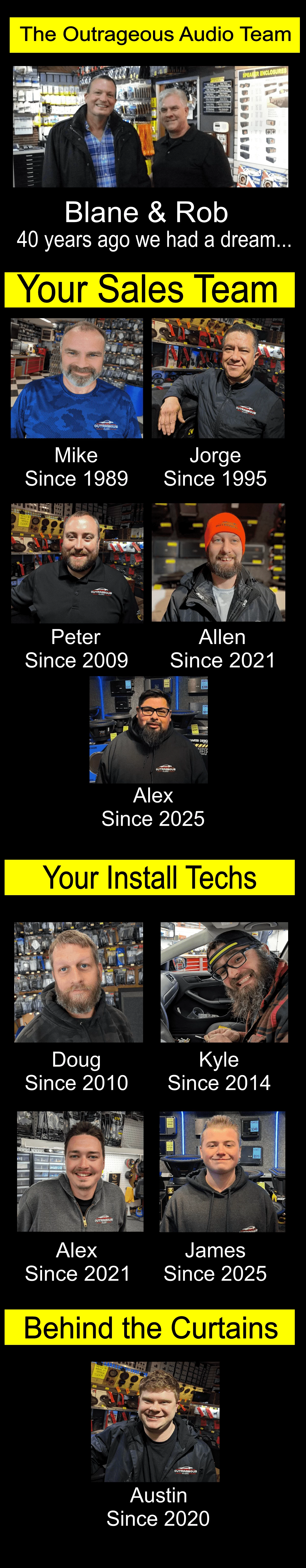 One of the biggest qualities about Outrageous Audio is that each person here has chosen car audio as a "Career". We are not "kids" working a "job". The combined expertise in this store is unsurpassed. You can ask any of us a question about car audio and you will get a straight, honest, educated answer. From custom installs, to basic questions, or maybe some advice. We are all here for you. We have chosen car audio as our career because we love to see the smiles we put on faces every single day. Come experience the last of the family type stores.